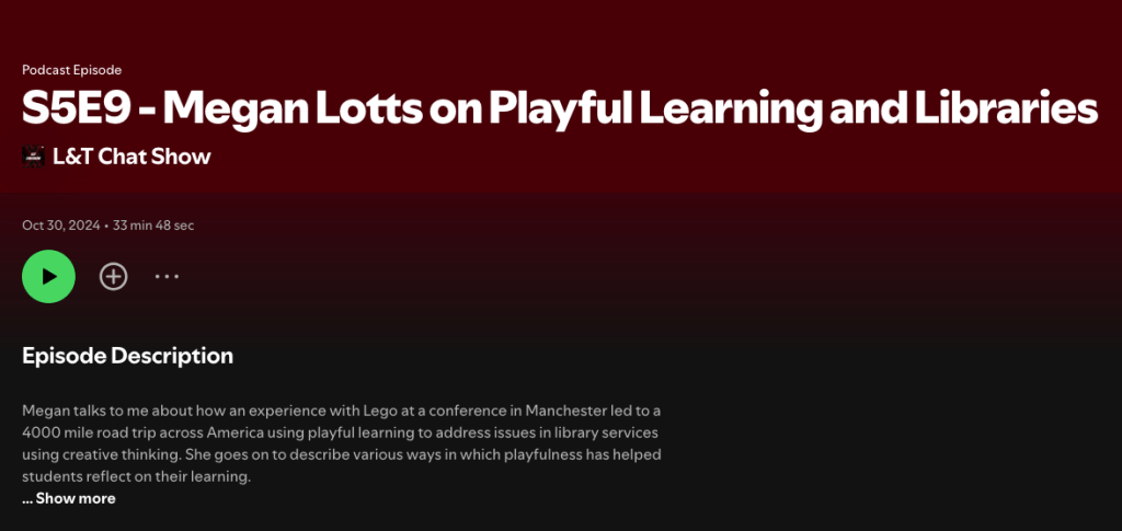 On Season 5 Episode 9 of the L&T Chat Show (Oct. 30, 2024) with Roger Saunders, “Megan talks to me about how an experience with Lego at a conference in Manchester led to a 4000 mile road trip across America using playful learning to address issues in library services using creative thinking. She goes on to describe various ways in which playfulness has helped students reflect on their learning.”