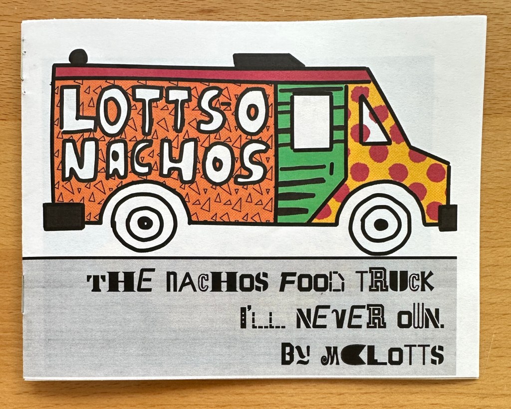 Artwork Nacho Food Truck Dreams Posted by Megan Lotts on July 8, 2025 I honor of international zine month 2025 I made a zine about my love of nachos, high drama reality TV, and food trucks. It also includes nacho art and a few 6-word stories. Share this: Click to share on X (Opens in new window) X Click to share on Facebook (Opens in new window) Facebook Like Loading... Related