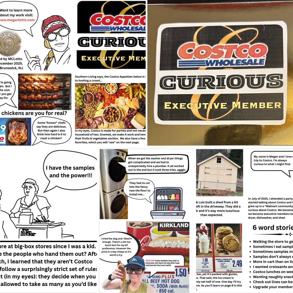 In July of 2025, I attended a party at a friends house where we started talking about Costco and I began visualizing this zine. I grew up in a “Walmart community” therefore I’ve always been curious about Costco . We became members in 2022 and in 2024 we became executive members because we bought a washer/dryer, dishwasher, and shed. This zine shares a few of my thoughts about Costco and to why I’m curious.